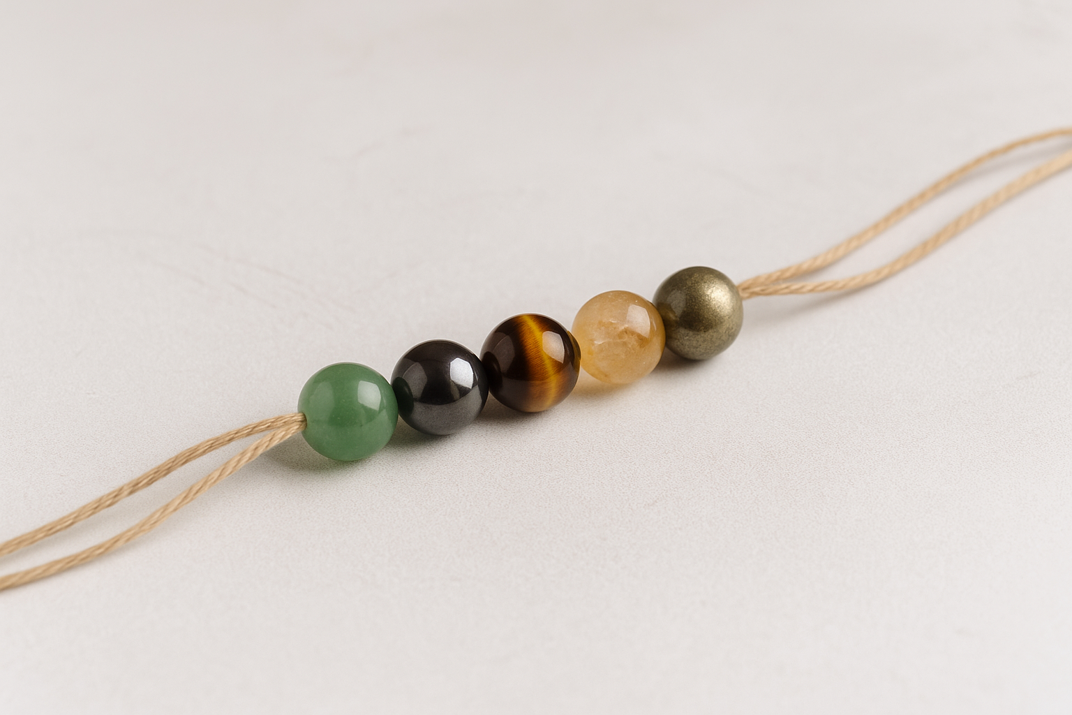 The Abundance Bond Rakhi is more than just a thread—it's a symbol of protection, intention, and abundance. Handcrafted with 5 powerful crystals—Pyrite, Citrine, Tiger Eye, Hematite, and Green Aventurine—each bead is selected for its energy to attract wealth, focus, strength, and positive flow.